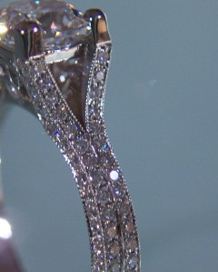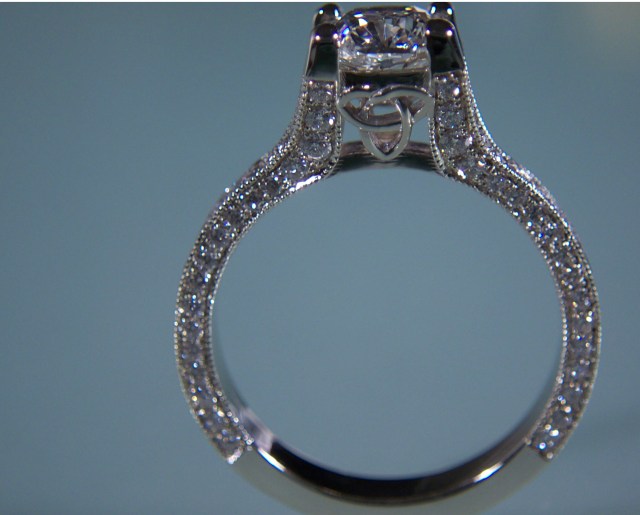 Custom made 18k white gold ring with a 1.05 carat cushion cut center stone and 144 accent diamonds with a Celtic knot foundation.
