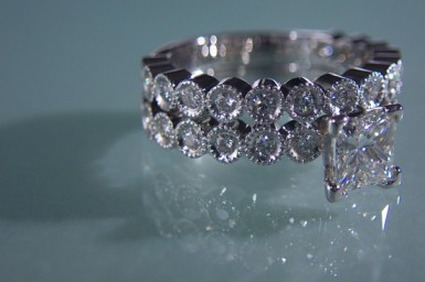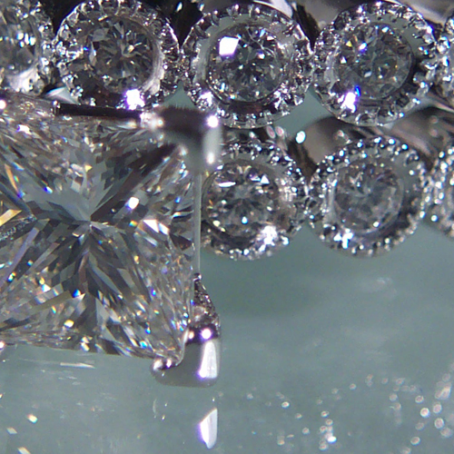 Hand fabricated wedding and engagement ring set with a 1 carat+ princess cut center diamond and accent diamonds set in 18k white gold