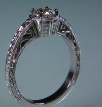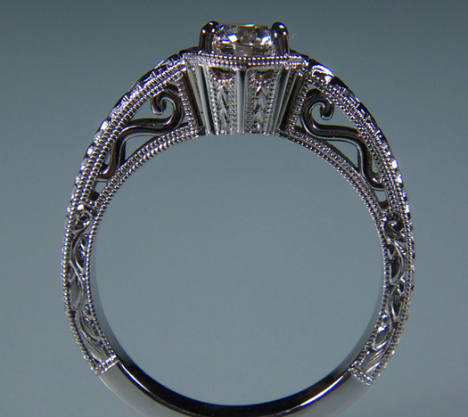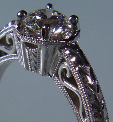 Custom designed, hand engraved 18k white gold ring with a .54 carat round diamond