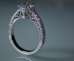Custom designed, hand engraved 18k white gold ring with a 1.09 carat center stone and accent diamonds