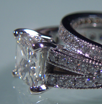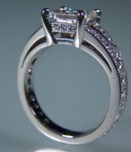 A princess cut diamond center stone was set in 18k white gold with a low profile for a client who works with her hands a lot. It has accent diamonds on the base and on the split shank as well as on the matching wedding band.