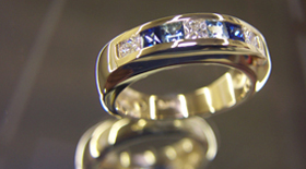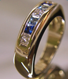 14k yellow gold with channel set diamonds, sapphires and aquamarines