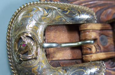 Based on the design of a 1950s western gun holster belt, this ring is hand fabricated in 14k yellow gold with a diamond cut ruby eye set on a body of sterling silver hand engraved to recall the tooled leather belt.