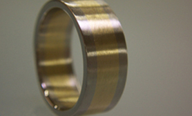 Hand-forged 18k yellow gold and platinum ring with 1 carat center diamond and matching man’s band