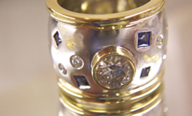 Two tone 18k white and yellow gold ring with inlaid 22k gold and accent stones of sapphires and diamonds with a 1 carat round bezel set center diamond
