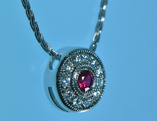 12 diamonds totaling 1/3 carat set in 18k white gold with a 1/4 carat diamond-cut ruby center stone