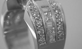 Platinum ring with 2 carat center diamond and accent stones consisting of round, baguette and princess cut diamonds